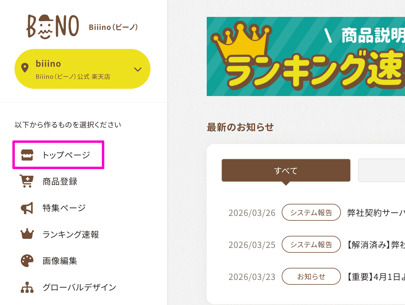 ビーノ管理画面のサイドメニューから「トップページ」をクリックします。