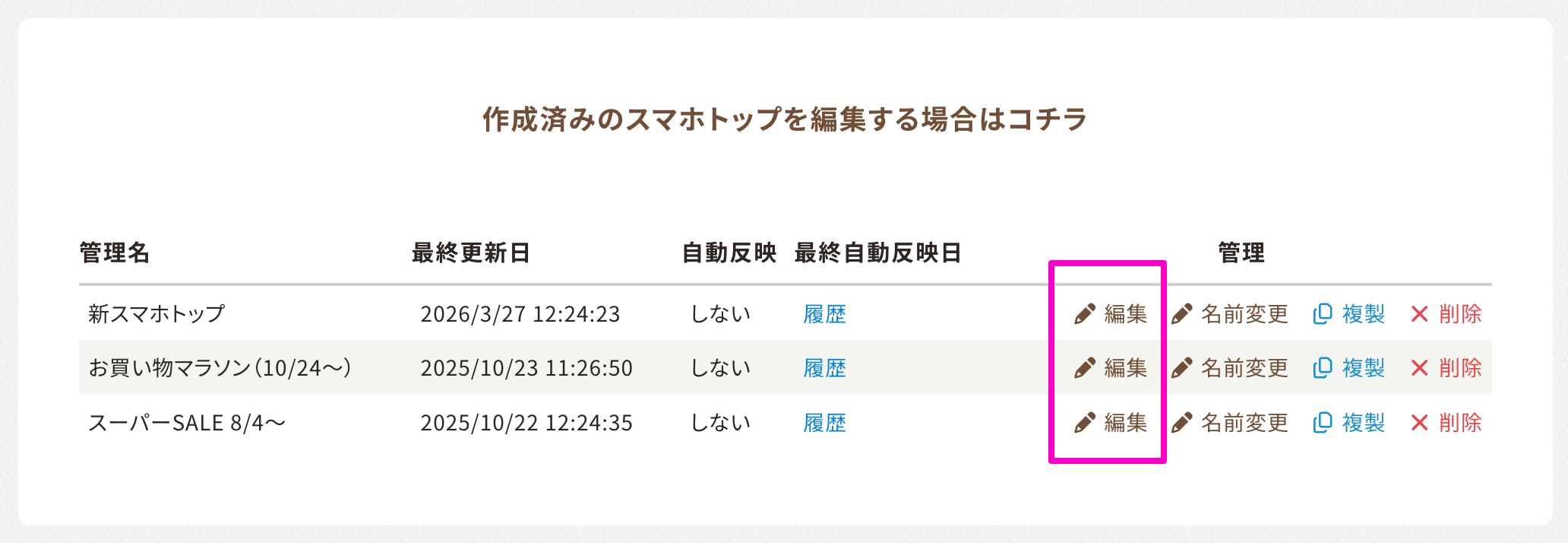 特集ページへのリンクを設定したいトップページの「編集」をクリックします。