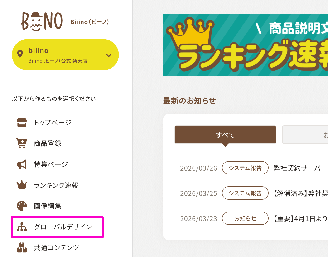 ビーノ管理画面のサイドメニューから「グローバルデザイン」をクリックします。