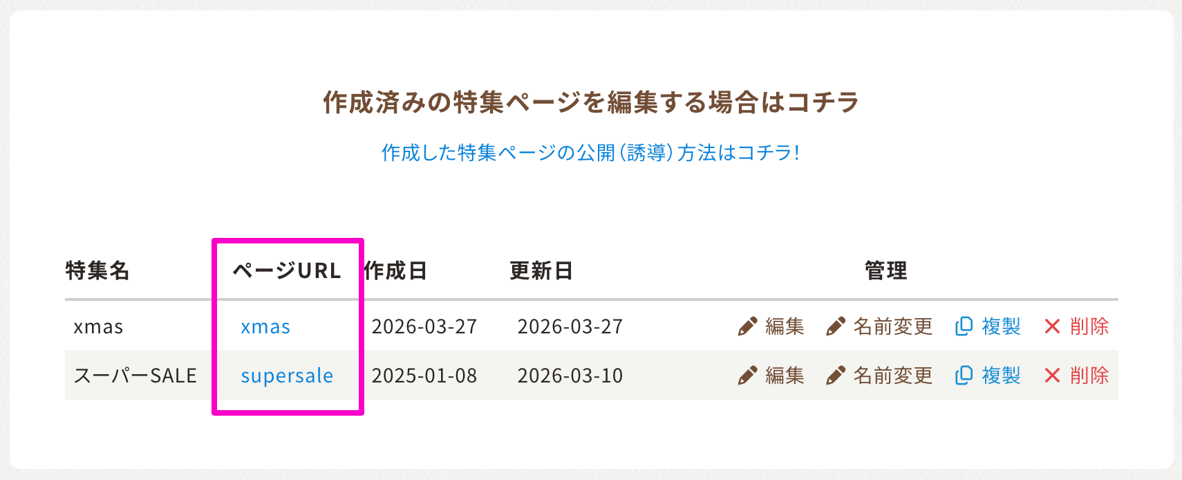 お客様に見せたい特集ページの「ページURL」をクリックして、特集ページを開きましょう!