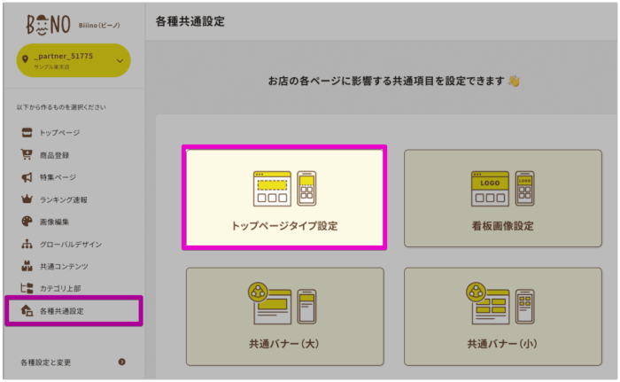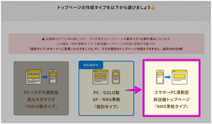 「ビーノ管理画面 > 各種共通設定 > トップページタイプ設定」より、「個別タイプ」から「RMS準拠タイプ」へ切り替えをお願いします。