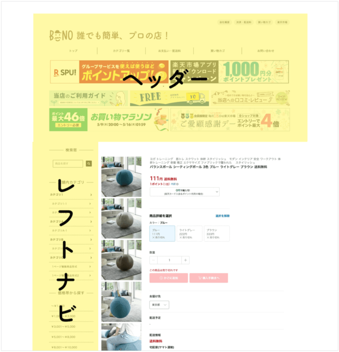 PC商品ページ バナー ヘッダー 編集方法 商品ページの更新 ヘッダー・フッター・レフトナビ レフトナビゲーション ビーノデザイン PC商品ページ上部 PCカテゴリページ上部 カテゴリーページ