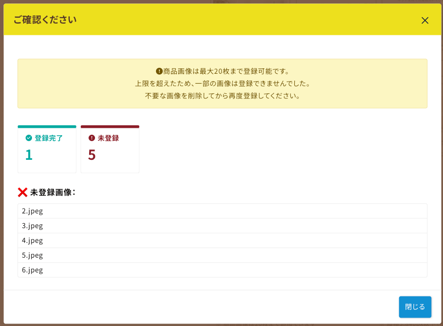 ※「基本情報 > 商品画像」に設定する場合、登録済み画像と合わせて20枚を超えている状態で「開く」を押すと、エラーが表示され、20枚を超えた分の画像は登録されません。