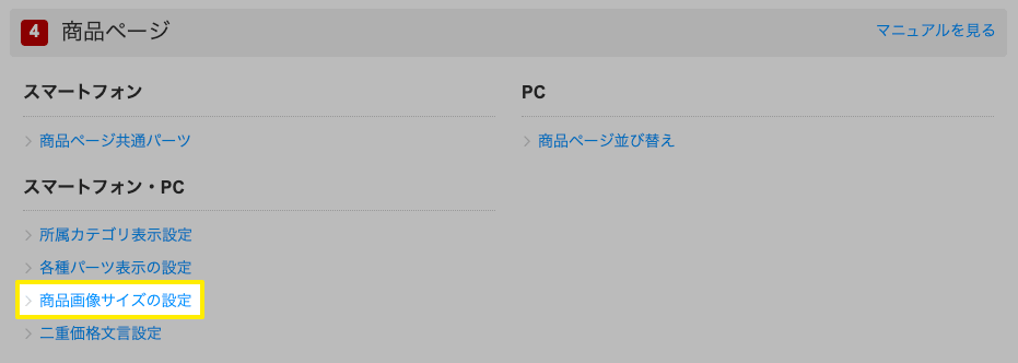 楽天RMS > 店舗設定 > 5 デザイン設定 > 4 商品ページ > 商品画像サイズの設定