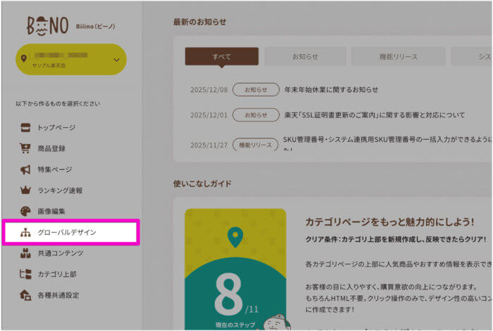 なお、もし意図せず、PCトップページを新店舗トップページへ移行されてしまった場合など、ビーノで作成されたGOLD製トップページを表示したいといった場合は、以下よくあるご質問をご参考ください。