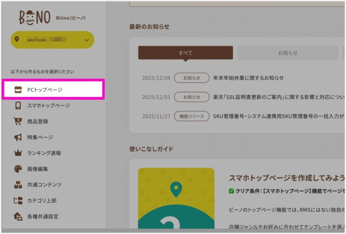 - ビーノ管理画面に「PCトップページを作る」ボタンが表示されている場合