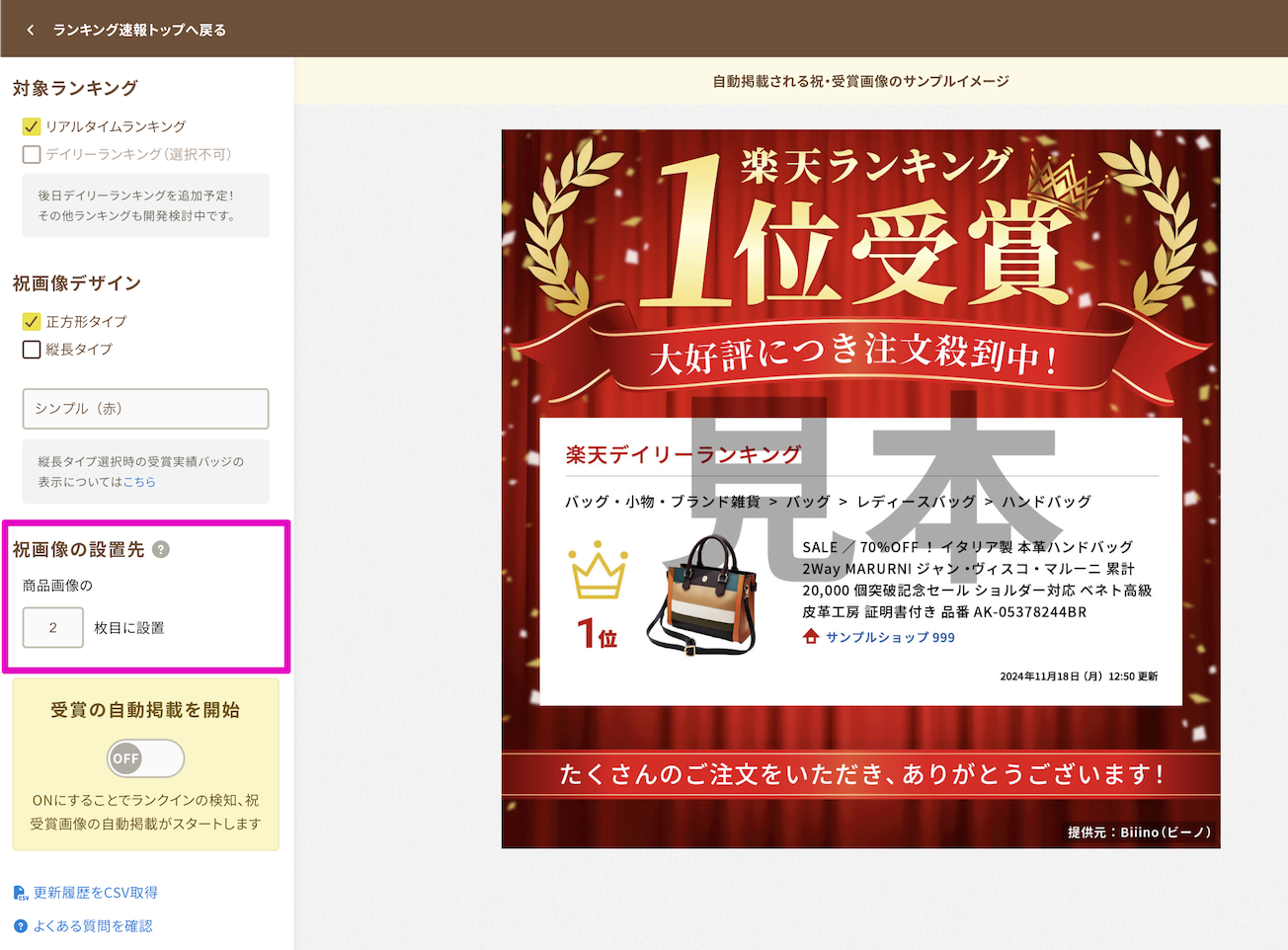- 「ON」にして以降、1位を受賞した商品へ自動で祝画像が反映されます。