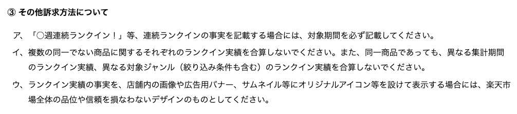 RMS店舗運営Navi:楽天ランキングへのランクイン実績等の表示に関するガイドラインより抜粋