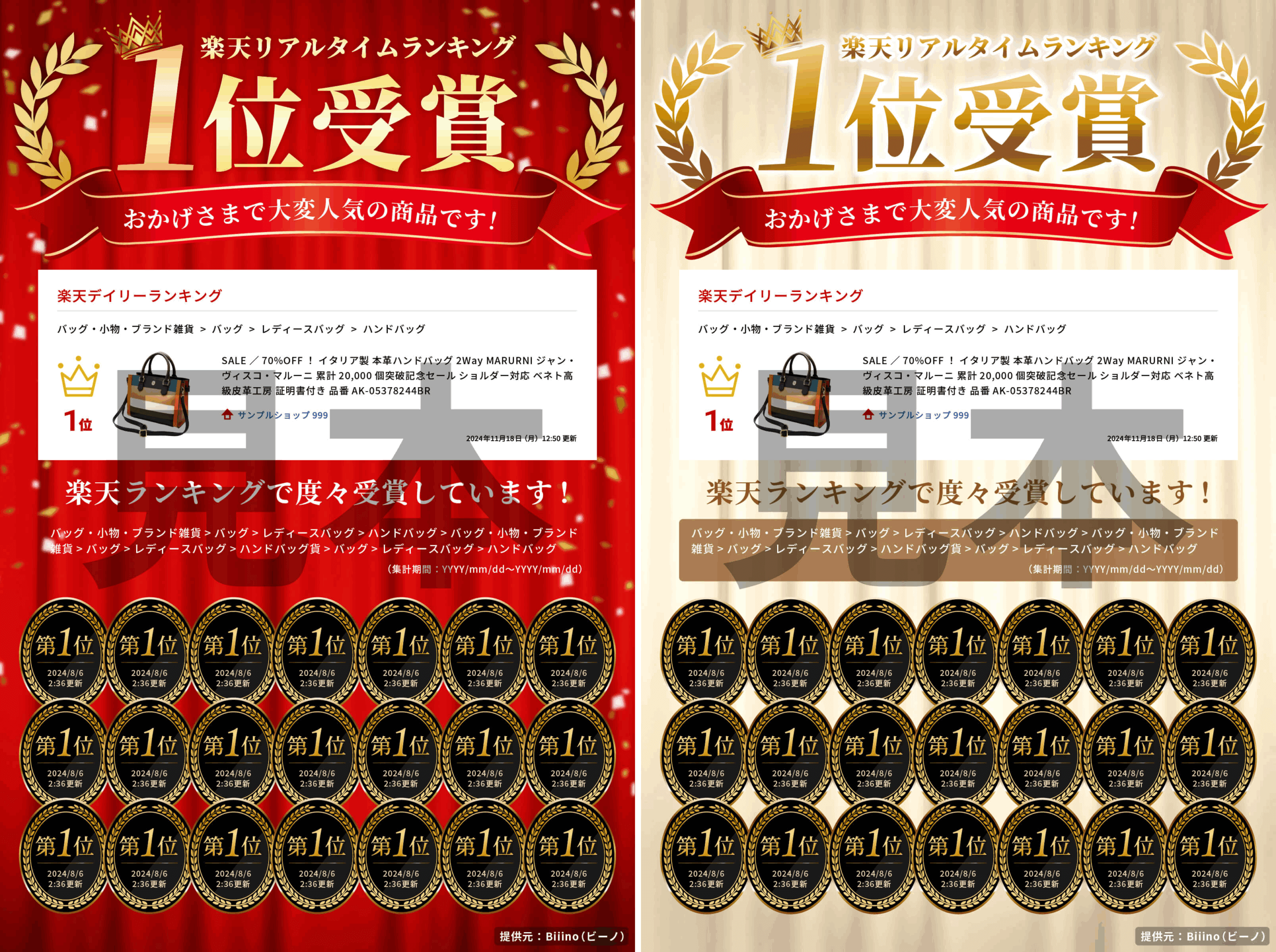 恐れ入りますが、ビーノでは楽天市場のランキング受賞掲載に関するルール強化を踏まえ、「◯冠獲得」や「合計◯回受賞」といった表現には対応しておりません。