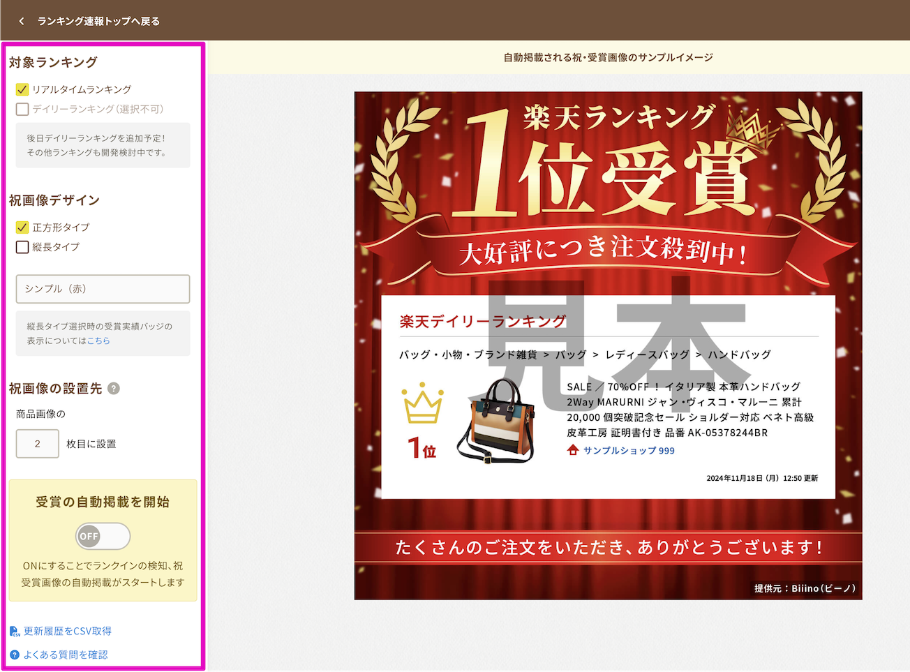以下の手順で、楽天ランキング受賞時に「受賞画像」が自動で生成され、商品ページに掲載することができます。
