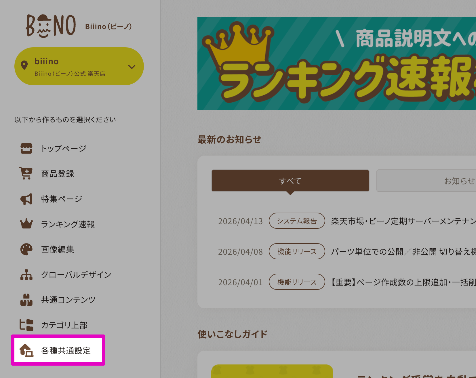 1. ビーノ管理画面の左メニューより「各種共通設定」をクリック