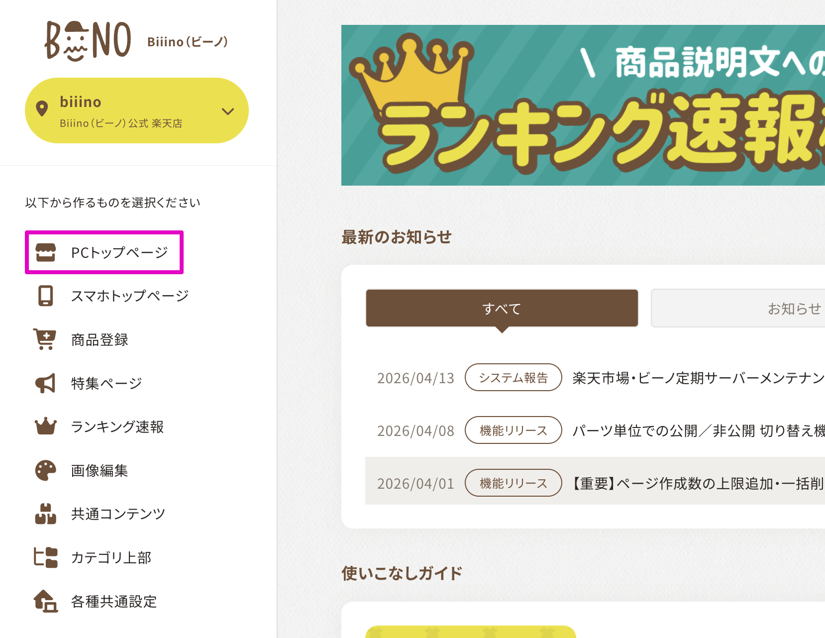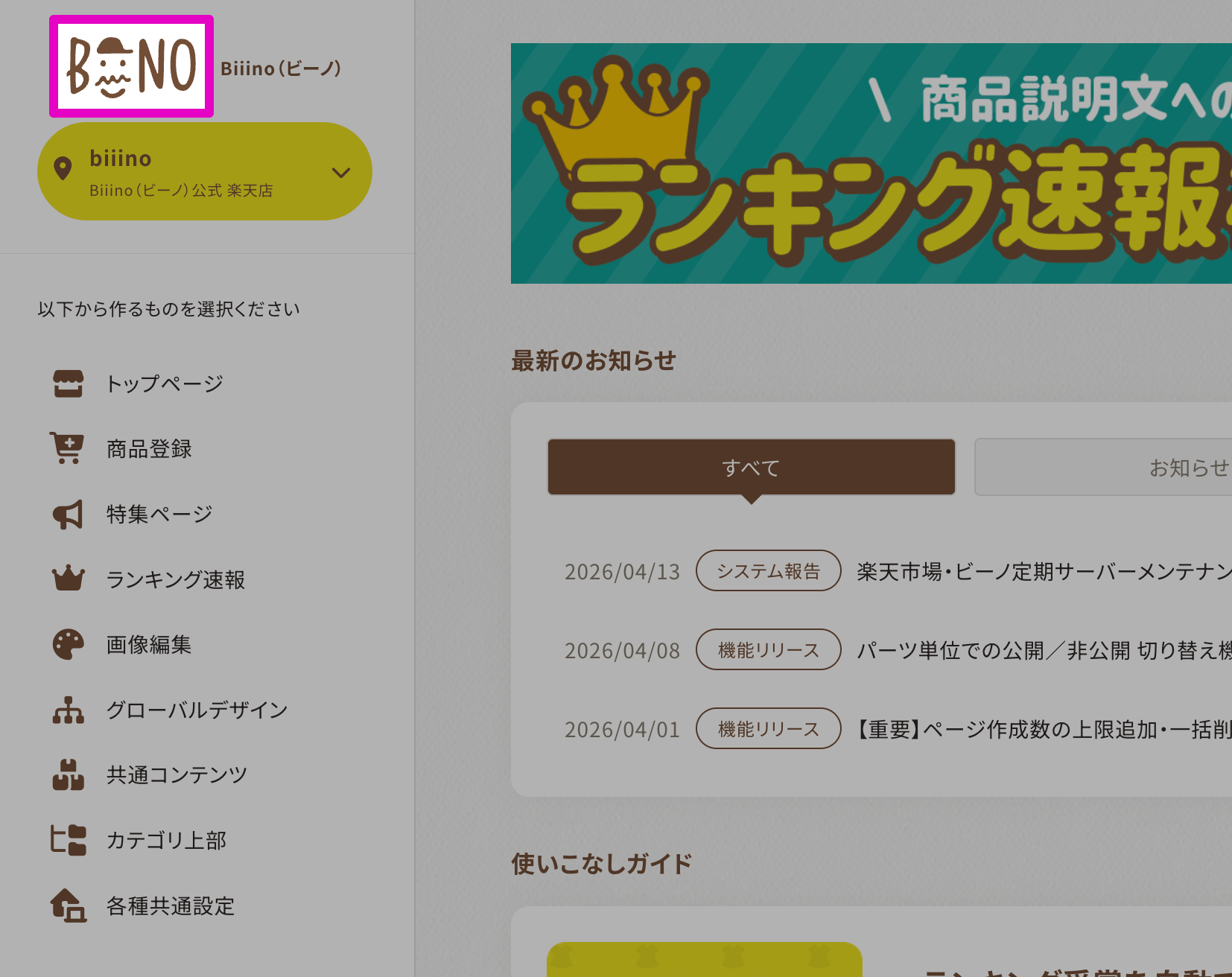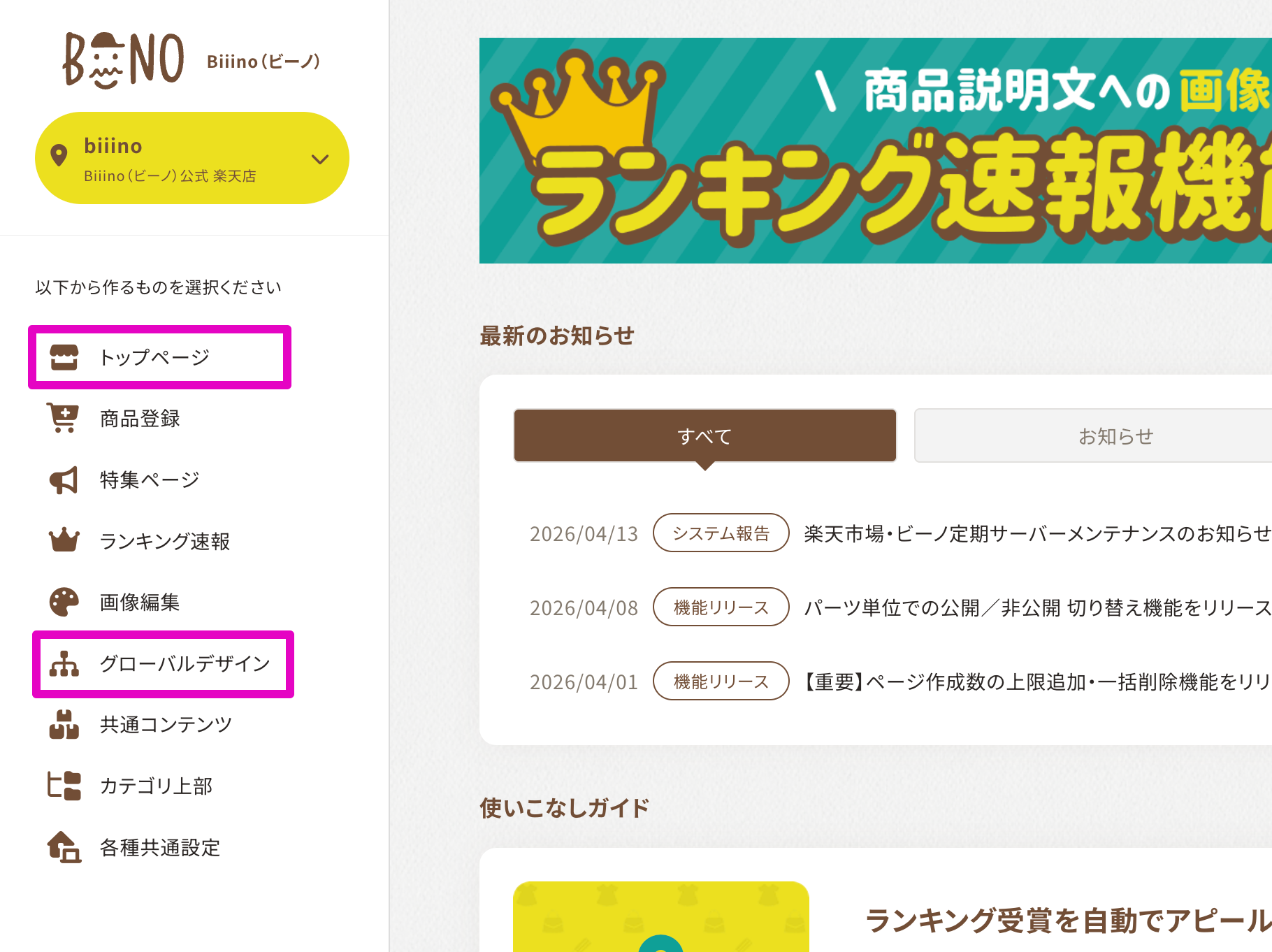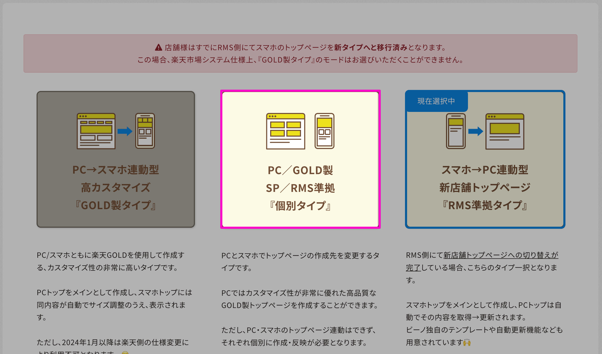 ※ 2026年1月の楽天市場による全店舗様での新店舗トップページ移行完了に伴い、ビーノではトップページ作成タイプを「RMS準拠タイプ」へ一括変更いたしました。