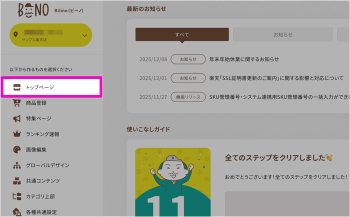 まずはビーノの左メニューで「トップページ」をクリックしましょう