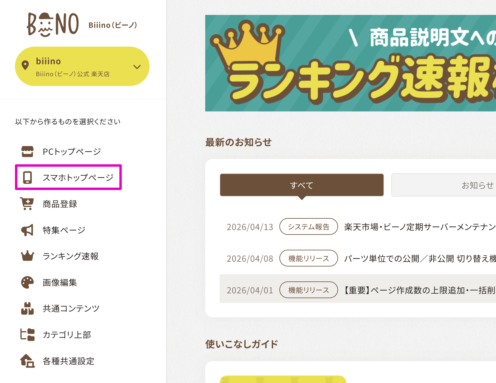 誘導バナーは、ビーノの「スマホトップページ」機能から設定します。