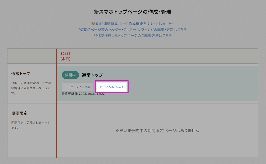 2.公開中のトップページ欄にある「ビーノへ取り込む」をクリックします