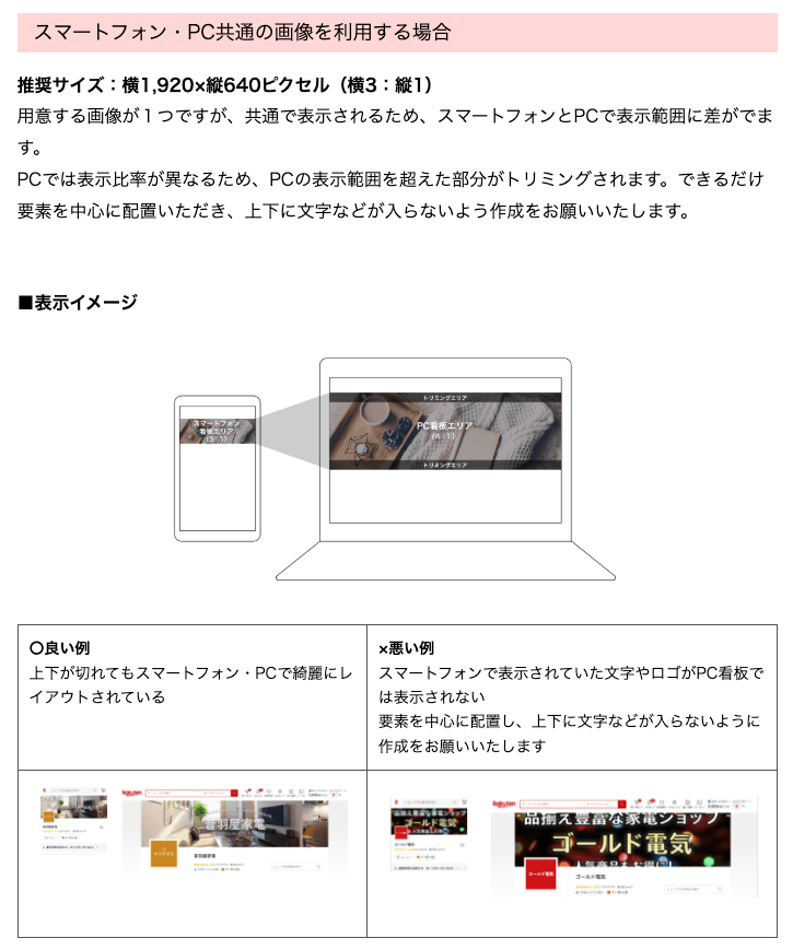 そのため、看板画像にご設定される要素はできるだけ中心に配置し、上下に文字などが入らないように作成する必要がございますことご注意くださいませ。